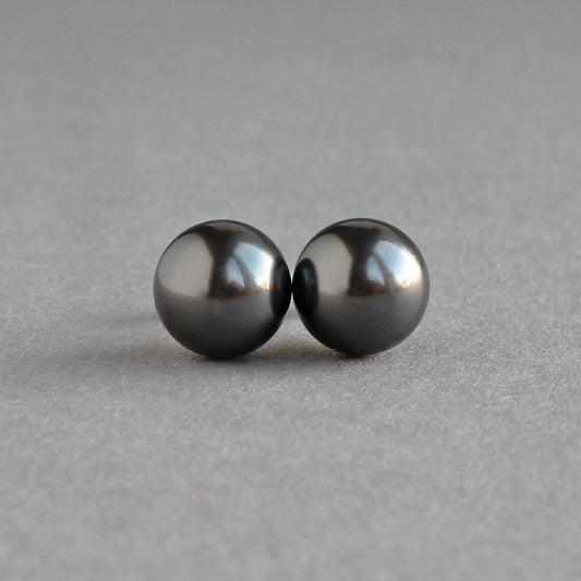 10mm Black Pearl Stud Earrings - Round, Large, Dark Grey Studs