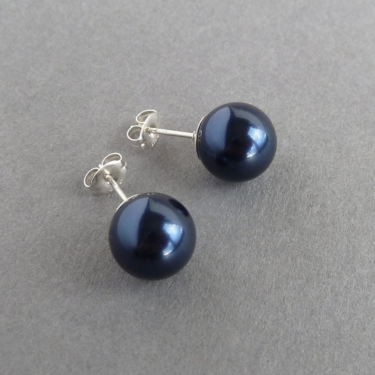 10mm Navy Pearl Stud Earrings - Large, Round, Dark Blue Studs