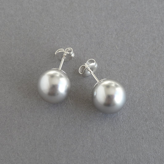 10mm Light Grey Pearl Stud Earrings - Large, Round, Silver Grey, Studs