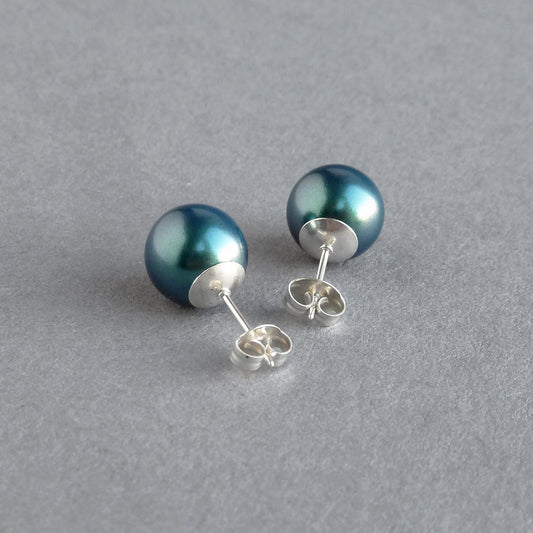 10mm Dark Green Pearl Stud Earrings - Chunky, Round, Teal, Glass Pearl Studs