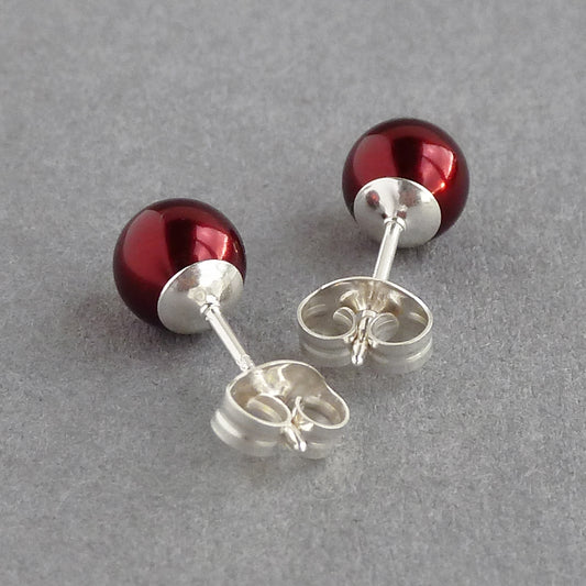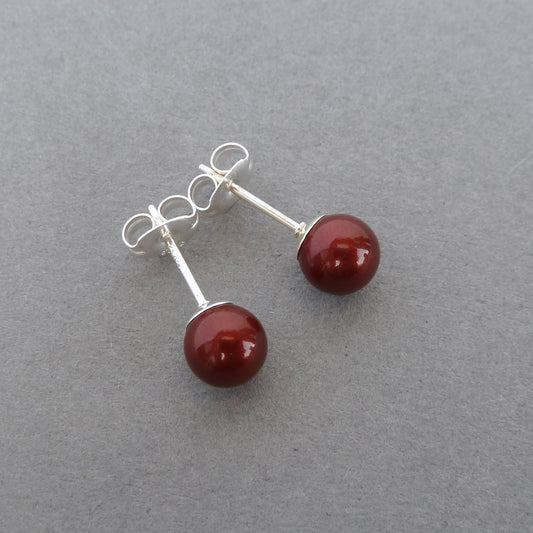 6mm Burgundy Pearl Stud Earrings - Small, Round, Dark Red, Coloured Glass Pearl Studs