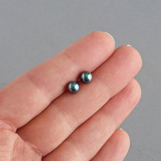 6mm Dark Green Pearl Studs - Small, Round, Teal, Glass Pearl, Stud Earrings