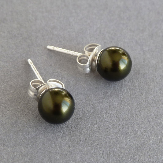6mm Dark Olive Pearl Studs - Small, Round, Dark Green, Glass Pearl Stud Earrings