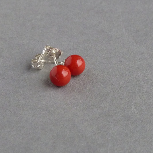 6mm Coral Red Stud Earrings - Small, Scarlet Red, Glass Pearl Studs