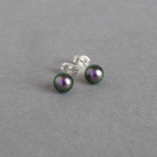 6mm Iridescent Purple Glass Pearl Studs - Small, Round, Dark Purple Stud Earrings