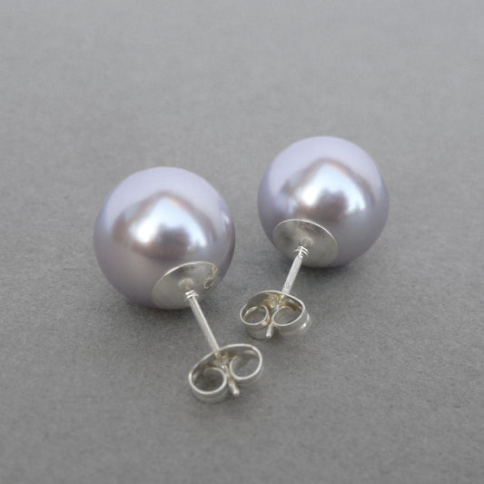 10mm Light Grey Pearl Stud Earrings - Large, Round, Silver Grey, Studs