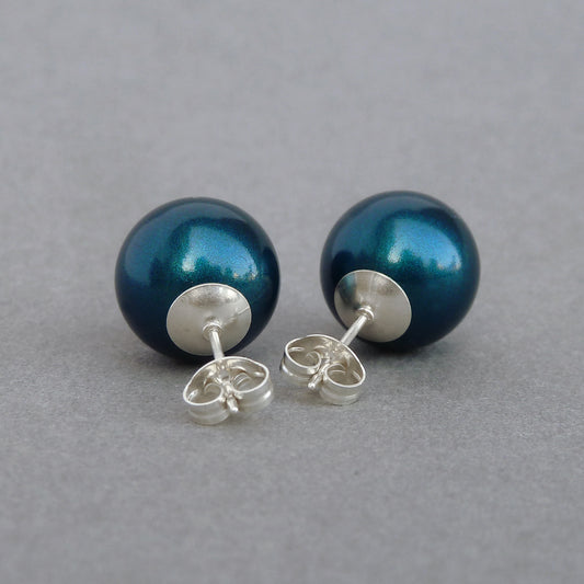 10mm Dark Green Pearl Stud Earrings - Chunky, Round, Teal, Glass Pearl Studs