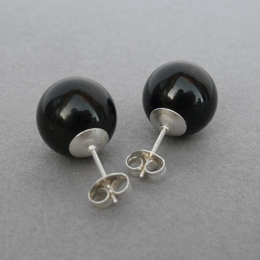 12mm Jet Black Glass Pearl Stud Earrings - Large Mystic Black Glass Studs