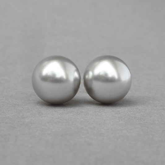 12mm Silver Grey Pearl Stud Earrings - Chunky, Light Grey, Glass Pearl Studs