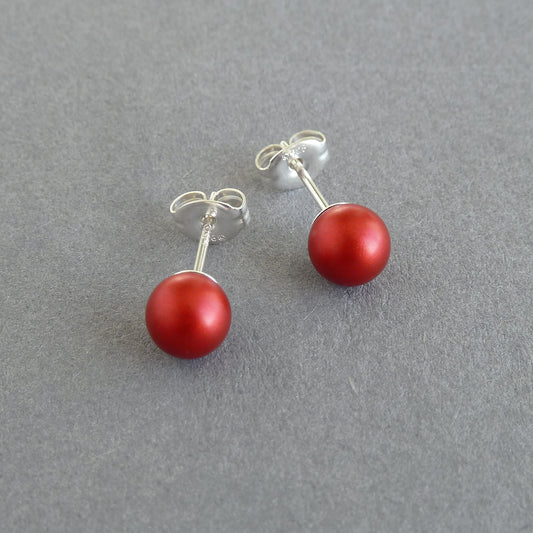 6mm Bright Red Pearl Stud Earrings - Small, Rouge, Coloured Glass Pearl Studs
