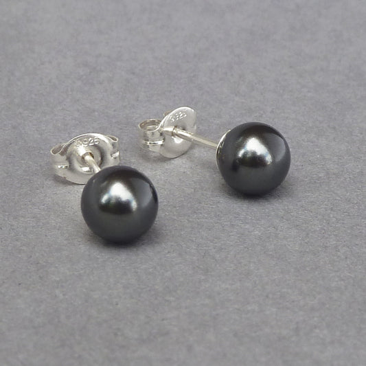 6mm Dark Grey Pearl Stud Earrings - Small, Round, Black, Glass Pearl Studs