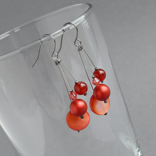 Bright Red Three Strand Earrings - Long Coral Pearl Drop/Dangle Earrings for Women