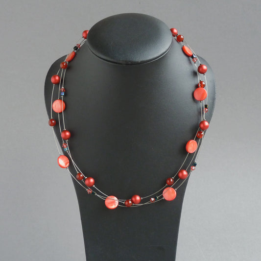 Bright Red Floating Pearl Necklace - Christmas Red Multi-Strand Necklaces