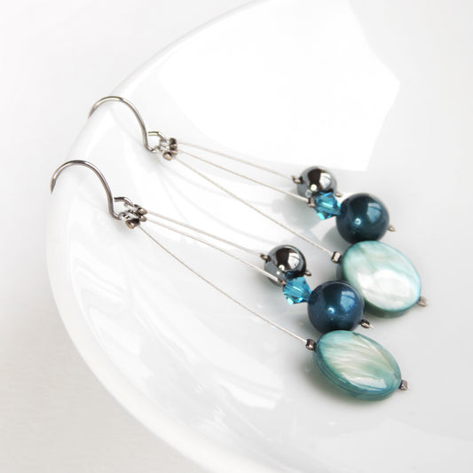 Three Strand Teal Drop Earrings - Long, Petrol Blue, Dangly Earrings