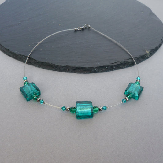 Turquoise Fused Glass Necklace - Sea Blue, Square, Silver Foil Lined Bead Necklaces