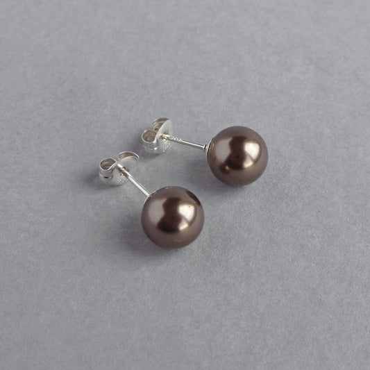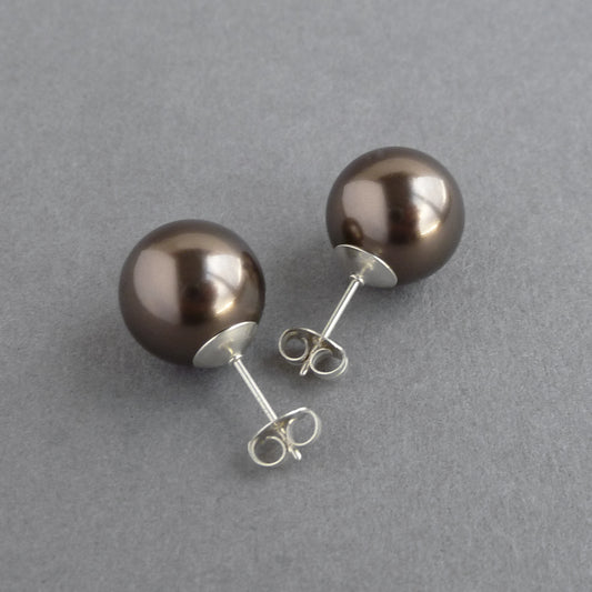 8mm Chocolate Pearl Stud Earrings - Round, Dark Brown, Glass Pearl Studs