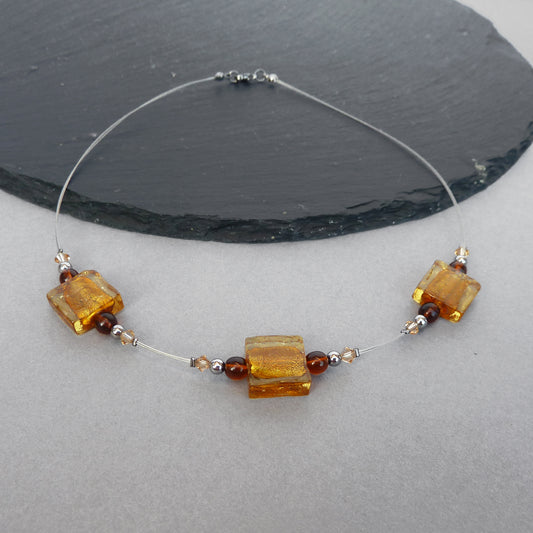 Amber Fused Glass Necklace - Gold Lampwork Bead Necklaces