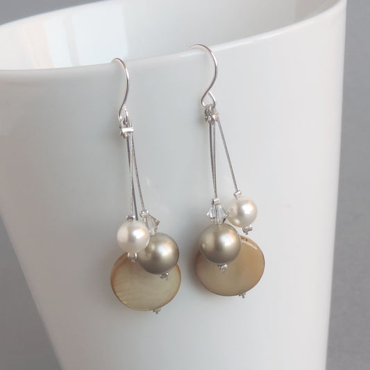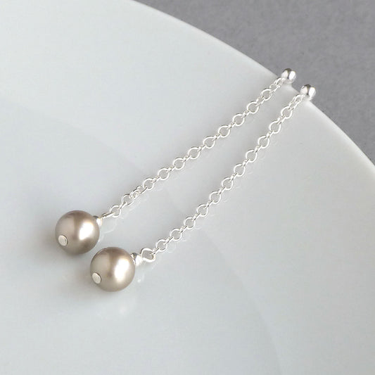 Champagne Pearl Drop Earrings - Dainty, Taupe and Silver Chain, Dangle Earrings