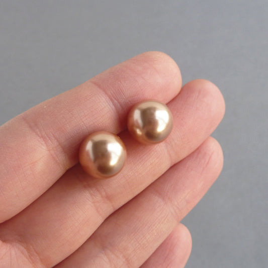 12mm Rose Gold Pearl Stud Earrings - Chunky, Round, Copper Coloured Glass Pearl Studs