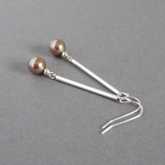 Bronze Pearl and Sterling Silver Bar Drop Earrings - Long, Light Brown, Everyday, Dangle Earrings