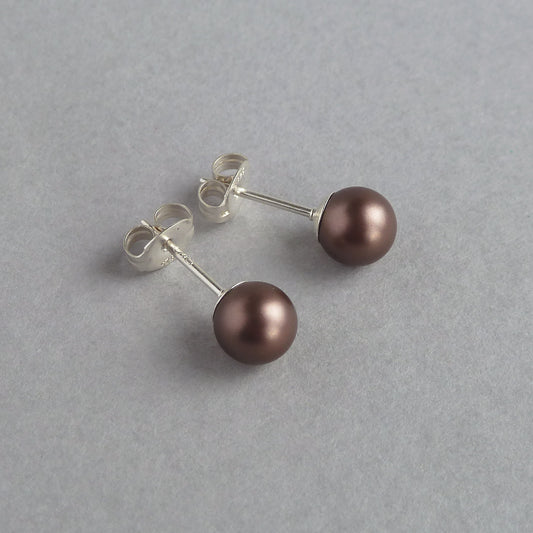 6mm Velvet Brown Glass Pearl Studs - Small, Round, Satin Bronze Stud Earrings