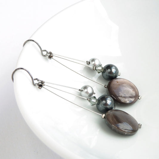 Dark Grey Pearl and Sterling Silver Bar Drop Earrings - Long, Black Pearl, Dangle Earrings