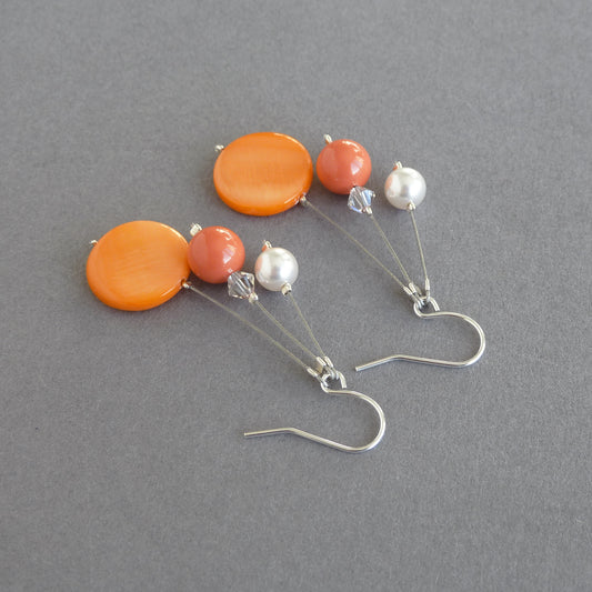 Orange Three Strand Drop Earrings - Long, Tangerine, Multi-strand, Dangle Earrings
