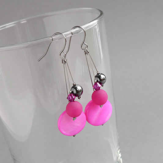 Hot Pink Drop Earrings - Fuchsia Three Strand Dangle Earrings