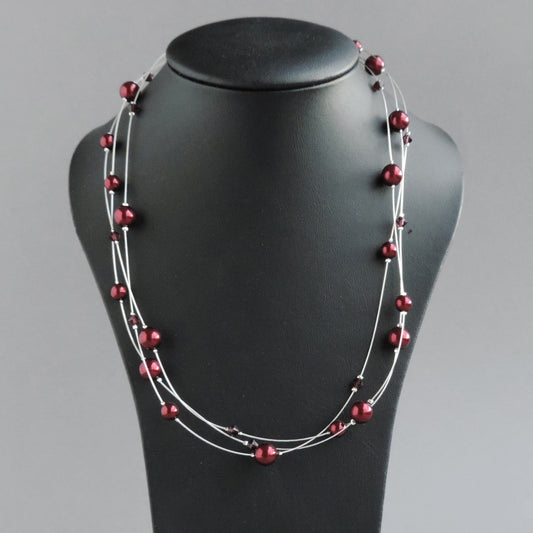 Burgundy Floating Pearl Necklace - Dark Red Three Strand Necklaces