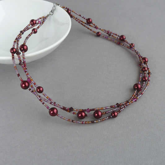 Burgundy Multi-strand Pearl Necklace - Dark Red, Beaded, Twisted Necklaces