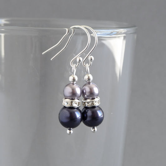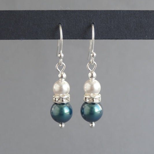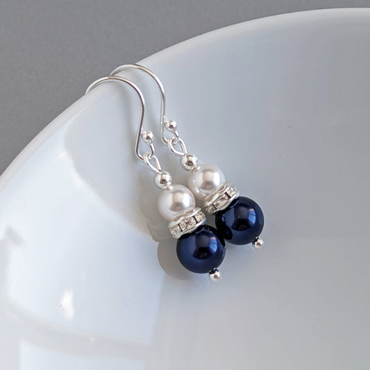 Navy Pearl and Crystal Drop Earrings - Dangly, Dark Blue and White, Bridesmaids Earrings