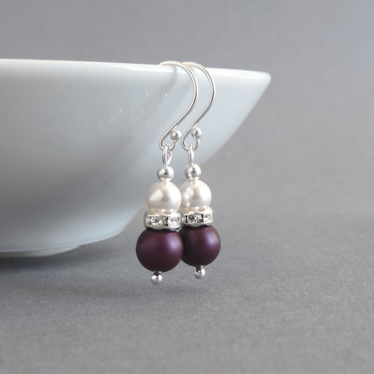 Plum Pearl and Crystal Drop Earrings - Dainty, Aubergine and White, Dangle Earrings