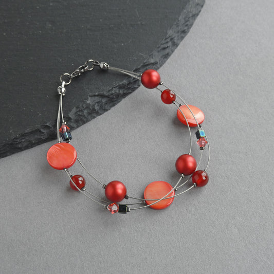 Bright Red Three Strand Bracelet - Coral Red Multi-strand Pearl Bracelets