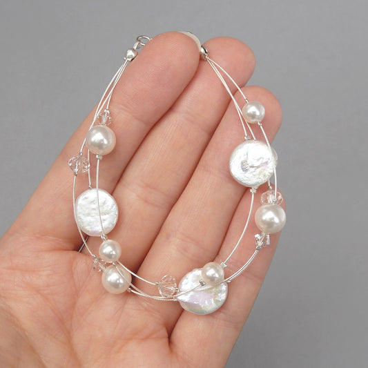 White Freshwater Pearl Multi-Strand Bracelet - White Pearl, Three Strand, Floating Bracelets